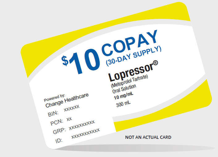 *Eligibility: Available to patients with commercial insurance coverage for Lopressor® (metoprolol tartrate) Oral Solution who meet eligibility criteria. This copay assistance program is not available to patients receiving prescription reimbursement under any federal, state, or government-funded insurance programs (for example, Medicare [including Part D], Medicare Advantage, Medigap, Medicaid, TRICARE, Department of Defense, or Veterans Affairs programs) or where prohibited by law. The offer is subject to change or termination without prior notice. Restrictions, including monthly maximums, may apply. This is not health insurance. For full Terms and Conditions, visit ConnectiveRx Customer Service at 877-384-1417 for additional information.